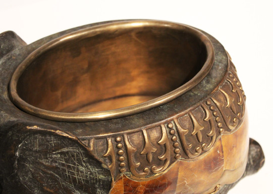 Փղի տեսքով արույրե զարդատուփ` մուգ բրոնզե երանգավորմամբ և պատինայով` սև և վագրային սադափե ներդիրներով։