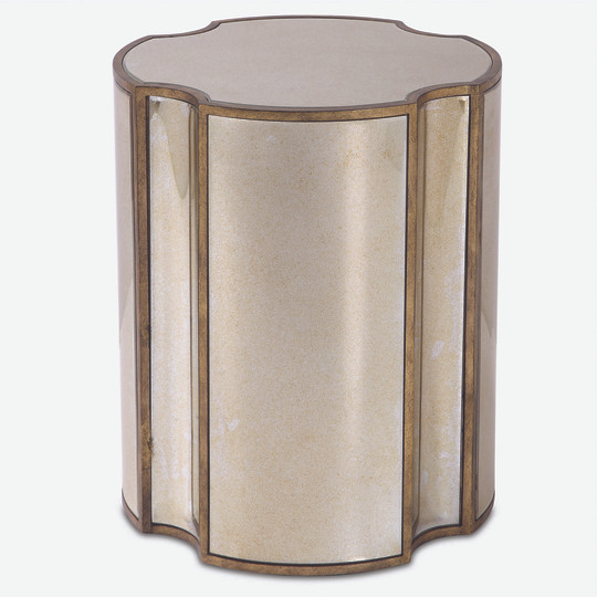 Add unique style to a space with this quatrefoil designed accent table. Each facet features a curved antique mirror surround, accented with antique brass finished framework.