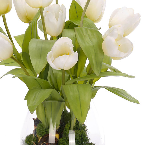 Embrace nature's charm with the white Tulip, thoughtfully displayed in a glass vase. Standing at 17", this lifelike faux design adds sophistication, perfect for a dining table centerpiece or console display. This piece brings everlasting elegance, staying vibrant for any occasion without the hassle of care.
