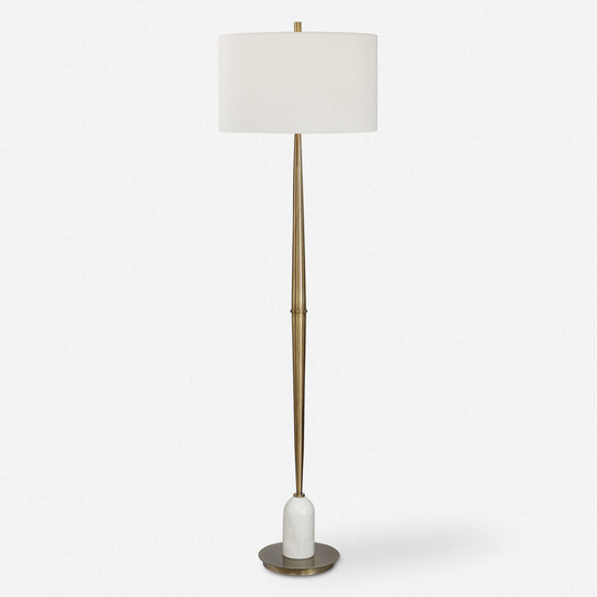 Этот торшер выполнен в переходном дизайне: основа сужается кверху и отделана гальванической бронзой с эффектом старения, дополнена отполированными вставками из белого мрамора. Круглый жёсткий абажур обтянут белой льняной тканью.