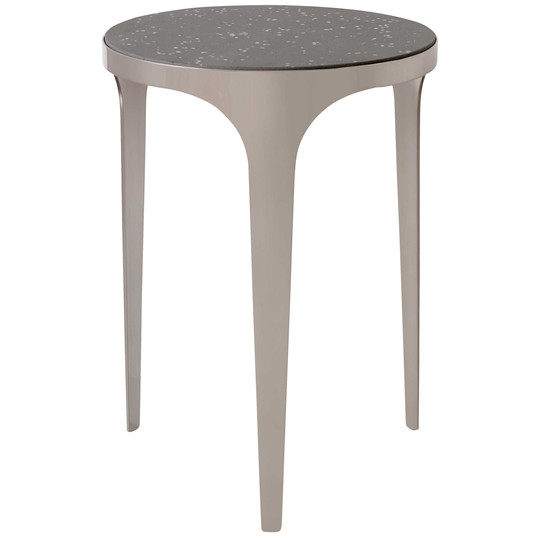 Этот современный приставной столик имеет круглую столешницу из светло-серого камня с белыми вкраплениями, создающими эффект терраццо. Стильное металлическое основание покрыто матовым никелем с гальваническим покрытием.