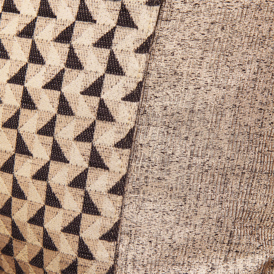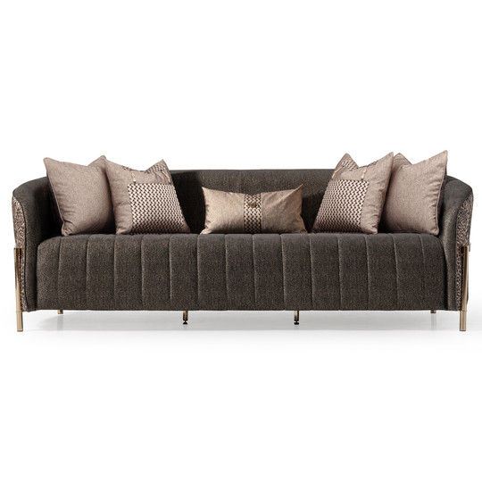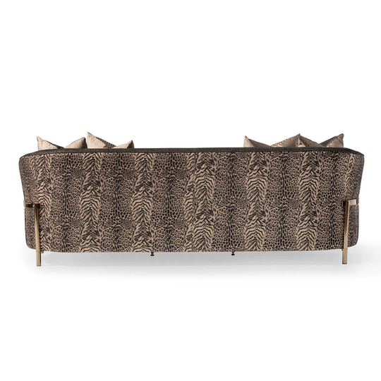 A true masterpiece designed to elevate your living space. Adorned with exquisite curves, this eye-catching piece features a gleaming gold metal show frame that accentuates its luxurious appeal. The front body is elegantly draped in rich shades of Onyx chenille, while the back boasts a stunning Tiger Eye chenille jacquard, creating a harmonious blend of texture and color. Matching pillows in a black pearl chenille jacquard fabric with obsidian accents complete the look.