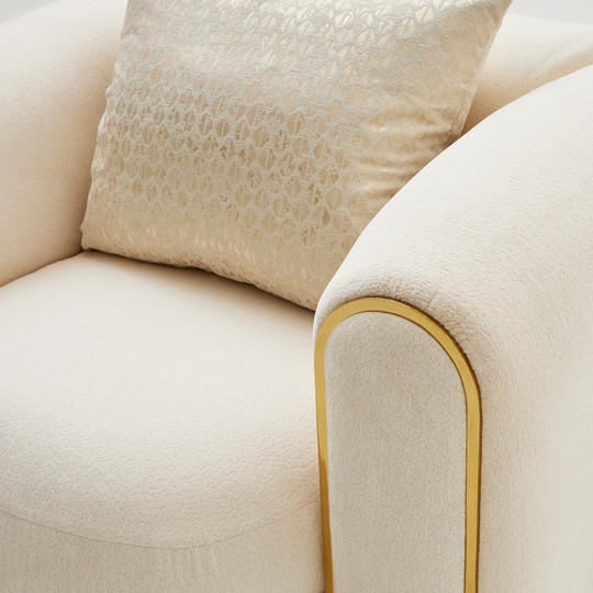 Кресло Sassani отличается мягко закруглёнными подлокотниками и уютным сиденьем, обитым роскошным жаккардовым шениллом. Это выразительное изделие дополняется одной декоративной подушкой из блестящей пряжи, придающей изысканность и текстурное разнообразие. Элегантные золотые акценты подчёркивают современный стиль, делая кресло идеальным для уютных уголков отдыха или в качестве стильного акцента в любом интерьере.