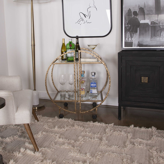 Эта универсальная барная тележка выполнена из кованого железа с эффектом молотковой текстуры и имеет состаренную золотую отделку. Она подходит для множества стилей дизайна. Она имеет две прозрачные закаленные стеклянные полки, а также колесики для легкости передвижения.